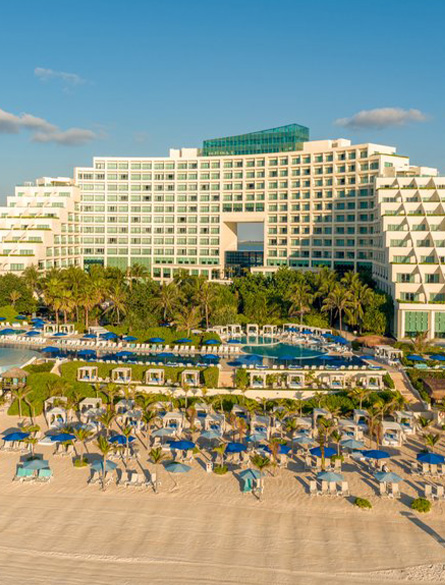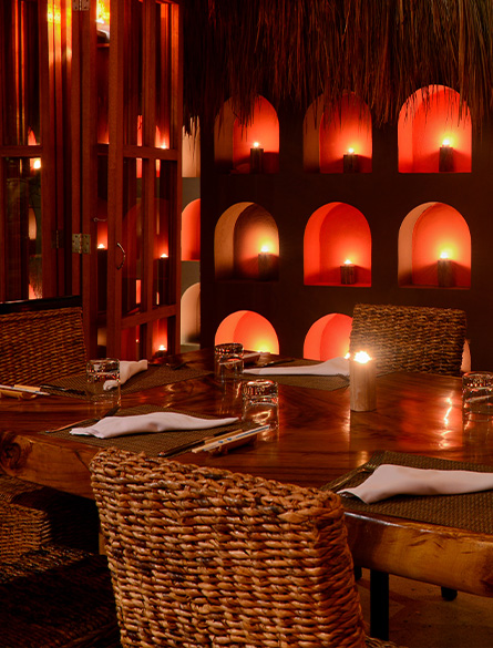 Private spaces are intentionally designed for both comfort and atmosphere, with customizable aromatherapy, adjustable lighting, and automated curtains that reveal the sunrise over the Caribbean. The 3,500-square-foot Presidential Suite is the ultimate retreat with a living area, bar, and two spacious bedrooms with spa-style baths. A private terrace overlooks the Caribbean and Nichupté Lagoon, while your personal butler anticipates every need.